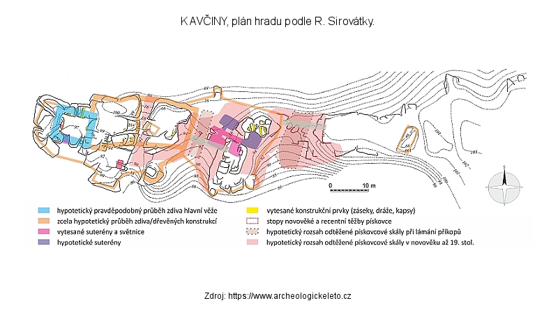 Kavčiny jsou příkladem malého, na pískovci založeného hradu patrně pomocné funkce s minimem zděných konstrukcí. Archeologický výzkum přinesl nálezy úlomků keramiky, mazanice, komorových kachlů,