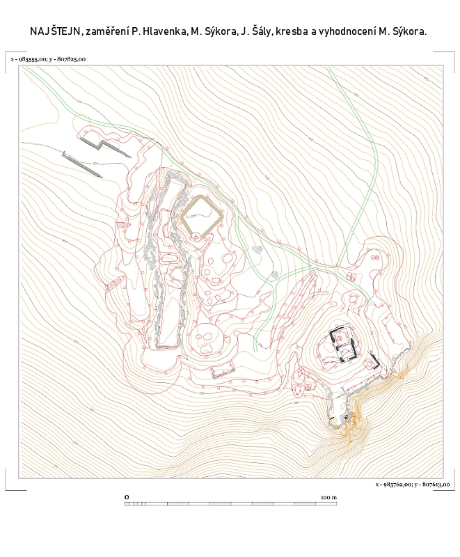 tak, že jeho delší osa byla v podstatě rovnoběžná s osou ostrožny. Na povrchu zadní části tvořené skálou dnes nejsou patrné pozůstatky žádné zástavby, pouze jedna drobná rozsedlina je uzavřena baštovitou zídkou